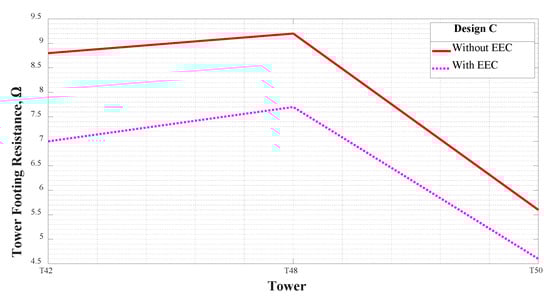 An EEC is deployed in regions with high soil resistivity to enclose electrodes to reduce tower footing resistance (TFR). This is normally indicated in case of a high soil resistivity (SR) value measured at the site, typically above 500 Ω⋅m in the case of a 500 kV tower. The use of EEC was incorporated in Design C, where it was considered as the better solution by TNB. The TFR value was found to be reduced by Design C and was further improved when the EEC was applied. Results of the use of this earthing design with the EEC are summarized in Table 6. They indicated that the TFR of the Tower T42 was reduced from 8.8 Ω to 7 Ω, whilst for Tower T48, the TFR decreased from 9.2 Ω to 7.7 Ω and from 5.6 Ω to 4.6 Ω for Tower T50. Therefore, EEC was found to be very effective at reducing the earth resistance to less than 5 Ω, as per TNB requirement for the 500 kV lines in Malaysia.