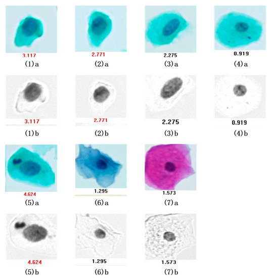 The microspectral images used to reflect absorbance-unmixing results are illustrated in Figure 6. Figure 6(1a–7a) shows the images of co-stained cytoplasms and nuclei, while Figure 6(1b–7b) shows the grayscale images of cell nuclei after absorbance unmixing. The value under each figure is the corresponding DI index of the cell. It can be seen that the morphology of the entire cell is clear, providing a promising way to analyze the relative size of the cytoplasm and the nucleus. According to the observed grayscale images, the DNA content could be further analyzed through using the nucleus after unmixing. DNA content in the image represents the integrated optical density. The DNA index is obtained through using the ratio of the integrated optical density of a single cell to the reference integrated optical density. It should be known that DNA index is a significant indicator for representing the content of the cell nucleus, further representing the number of ploidy in the process of cell proliferation, and reflecting the CV of nuclear content in the process of cell classification.