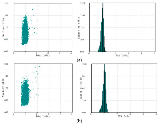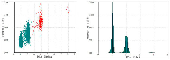 Figure 8 shows the scatter plots and histograms of one negative case obtained by two methods of analysis. Table 1 presents the quantity, mean of DI, standard deviation and CV of cells, in this case, obtained by two methods. Through analyzing the experimental results of the multi-spectral imaging system by mathematical statistics at a 95% confidence level, the confidence interval of the DNA indices of diploid cells is (0.998, 1.002), while the confidence interval of the DNA indices of tetraploid cells is (1.939, 2.179).