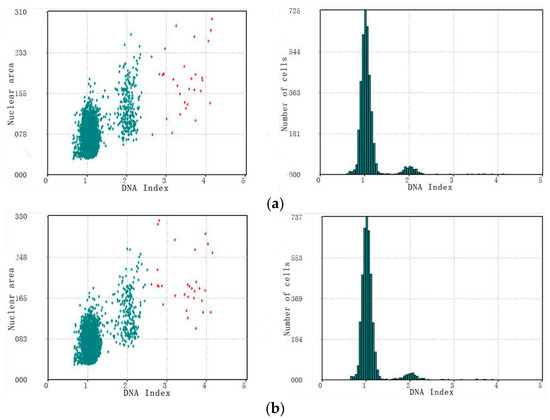 The analysis results of positive case; (a) the results of Feulgen-staining method, (b) the results of compound-staining method.