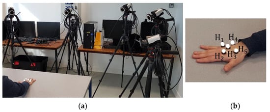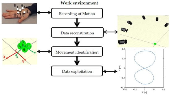 A healthy subject was asked to perform the prescribed drill in order to obtain a normal trajectory to use as a reference. This exercise involved five joints’ movements, namely the three rotations of the shoulder and the flexion/extension motion of the elbow and the wrist. The participant’s gestures were recorded using a Qualisys motion capture system with five infra-red cameras and five reflective markers attached to his hand as illustrated in Figure 1. Figure 2 illustrates the steps followed for the data acquisition.