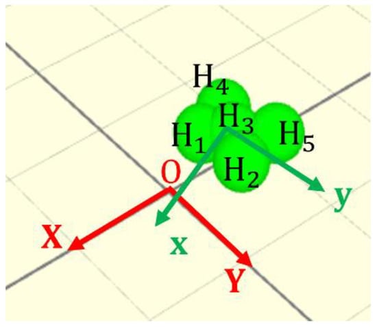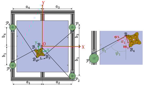 A planar cable-driven parallel robot with three degrees of freedom (DOFs) is considered in this paper. Since at least one more cable than the DOFs was needed to fully constrain the robot, four cables were used [24]. Their mass and elasticity were neglected. They were modeled as straight lines. The design process consisted of finding the optimal position of each actuator and the end-effector size satisfying a set of criteria and constraints. The motors’ positions were defined using the parameters and , which represent the coordinates of the center of the pulley , fixed on the actuator. The mobile platform was considered as a square of side (see Figure 5). The design vector is given by Equation (1). The global and the local frames ( and (, respectively, matched those represented in Figure 2, used for the motion capture analysis.