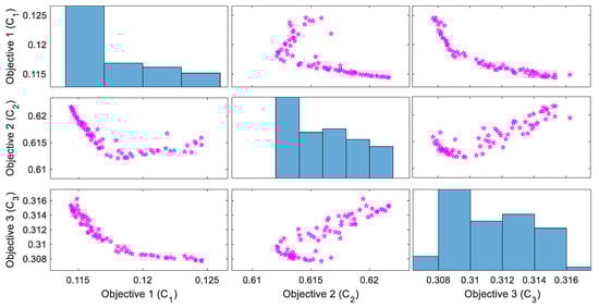 The equal weights method was used in our previous work [32]. In this paper, a deeper study of the appropriate values of these weighting coefficients is conducted in order to identify the impact of each coefficient on the quality of the final solution and the optimization process. A mapping of the global objective function and those corresponding to the three criteria is computed for all the possible coefficient values inside the interval (0,1) with respect to Equation (20), using the Particle Swarm Optimization algorithm (PSO) [33]. The computed variations are illustrated in Figure 8.