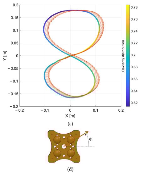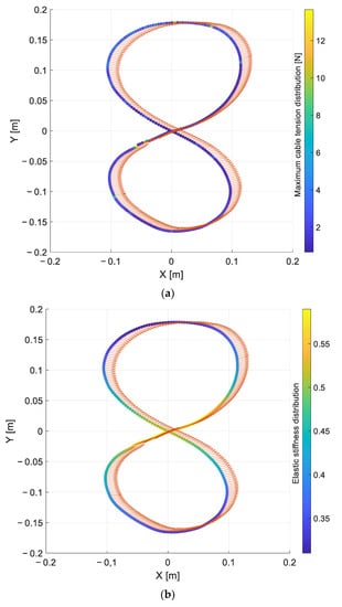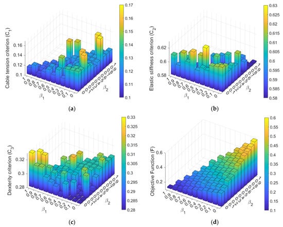 Referring to Figure 8d, the objective function decreases with . This means that the cable tension criterion has the greatest impact on the objective function compared to the other coefficients and . Thus, having a structure with a minimum cable tension distribution is easier than generating good dexterity and elastic stiffness.
