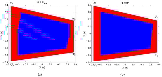 The 4 × 3 Jacobian matrix of the considered robot includes components of different physical units since the latter has mixed DOFs. To have a meaningful value of the condition number, the Jacobian matrix must be normalized allowing assessment of the closeness of a pose to a singularity. In order to settle the dimensional inhomogeneity, several methods have been suggested based on dividing the rotational elements of the Jacobian matrix by a conventional length . Lee et al. defined in [25] as a nominal length represented by the distance between the origins of the global and the local frames. Angeles introduced in [26] the notion of natural length, which is the value of that minimizes the condition number. This length is approximated to the radius of the end-effector [27]. The latter method was adopted in this paper. The homogenous Jacobian matrix, , of size 4 × 3, is calculated as given by Equation (10), where is the side length of the mobile platform.