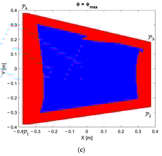 The free collision static workspace (in blue) for (a) , (b) and (c) .