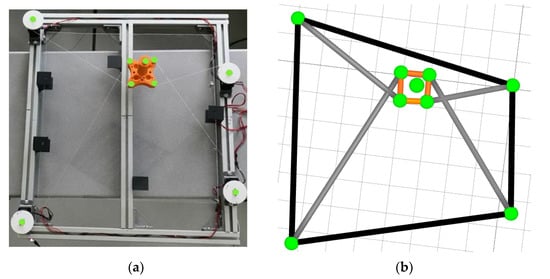 Following the optimization study detailed above, a CDPR prototype, presented in Figure 11a, was developed. The actuators’ positions and the end-effector size were adjusted according to the optimal design vector resulting in Table 2. It was composed of a rigid frame with four actuated pulleys controlling the end-effector poses by means of four cables. The patient sits near to the robot and grabs the mobile platform with his hand. Figure 11b shows the prototype representation using QTM (Qualisys Track Manager) software recording the passive markers’ locations along the end-effector movement.