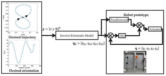 The extended position control mode was used for the actuator commands. The desired angular positions of the motors were computed using the inverse kinematic model. Figure 12 presents the block diagram of the robot control.