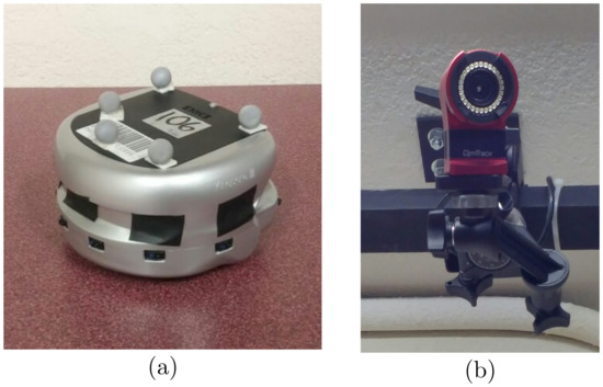 Experimental testbed: (a) Differential drive Khepera III mobile robot, and (b) Optitrack infrared camera.