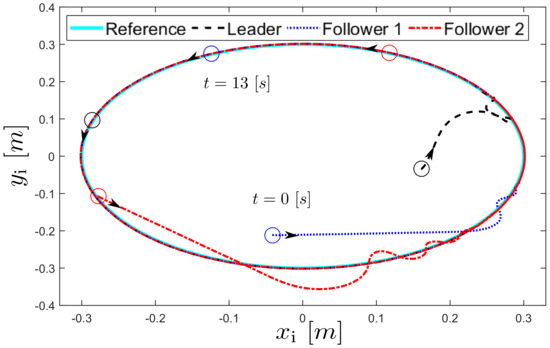 The trajectories of the robots obtained during the two experiments with the desired Cartesian trajectories are shown in Figure 3 and Figure 4, respectively. The figures also shown the robots’ positions at the time instants [s], [s] for the first experiment and [s] and [s] for the second experiment. In both cases, after the transient response the robots successfully achieve the convoy formation.