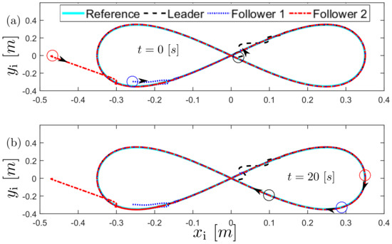 Trajectory of the robot group following the lemniscate curve: (a) Robots at s, and (b) Robots at s.