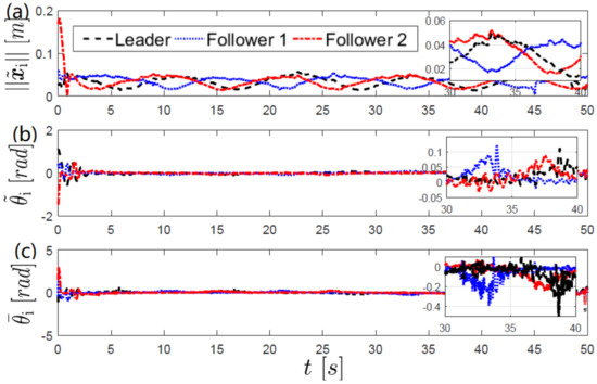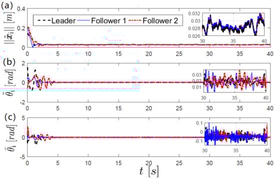 Consider a group of nonholonomic mobile robots described by (1) in closed loop with the control laws (22) and (24) in combination with the attitude observer (8). Furthermore, assume that and for all . Then, the leader-follower formation is achieved, i.e.,