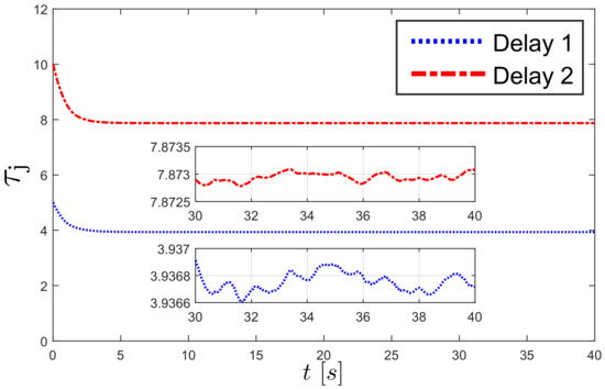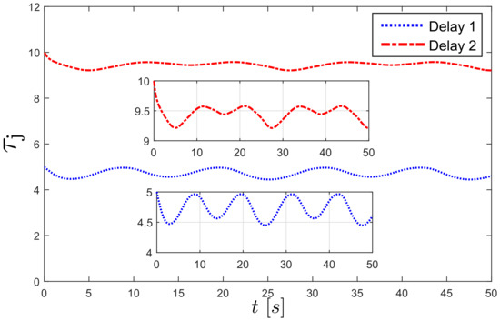 where , and are positive parameters and . For the first leader we have , and for we have . The second term in (19a) increases or decreases the magnitude of the time delay depending on the distance between the robots.