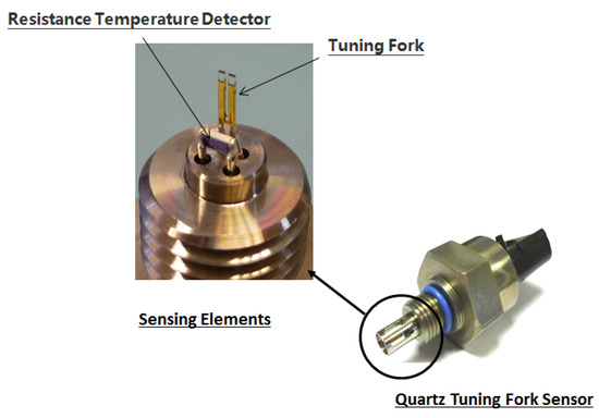 A physical diagram of the fluid property sensor is shown in Figure 2. The measurement parameters of the fluid property sensor are shown in Table 1. The fluid property sensor directly and simultaneously measures the viscosity, density, dielectric constant, and temperature of nonconductive fluids. Relying on patented tuning fork technology, the sensor monitors the direct and dynamic relationship between multiple physical properties to determine the quality, condition and contaminant loading of fluids such as engine oil, fuel, transmission and brake fluids, hydraulic and gear oils, refrigerants, and solvents. The capacity for multiparametric analysis improves fluid characterization algorithms. The fluid property sensor provides in-line monitoring of fluids for a wide range of OEM and aftermarket installations, including fluid reservoirs, process lines and pressurized high flow conduits (e.g., engine oil gallery) and for applications that include on- and off-road vehicles, compressors, industrial equipment and turbines. This paper will focus principally on engine oil applications, but most of these analyses can be adapted or replicated for other applications [23,24].