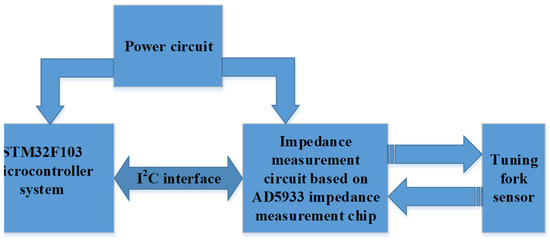 The hardware circuit design of this paper consists of two parts, an STM32F103 microcontroller system control circuit and impedance measurement circuit based on AD5933 impedance measurement chip. The hardware structure of the system is shown in Figure 3. The AD5933 chip is integrated with a DDS frequency generator, I–V amplifier, low-pass filter circuit, A/D conversion circuit, and FFT module, which can realize impedance measurements based on the vector current–voltage method in a high integration environment with certain accuracy. The chip realizes data communication through the I2C interface.The hardware structure of the system is designed as follows: