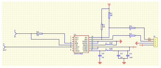 The peripheral circuit design of AD5933 is shown in Figure 4. The chip is powered by a 5-V power supply. The SCL and SDA pins of the microcontroller are used as I2C communication pins and are connected to the 15 and 16 pins of the AD5933 chip through a pull resistance of 10 kΩ. The AVDD and AGND of the analog circuit are directly connected with the VCC and GND, while the AVDD and DGND of the digital circuit are connected with the VCC and GND by a 10-uH chip inductor, respectively, to realize the separation of the analog and digital circuits. The input and output ends of the quartz tuning fork sensor are, respectively, connected to the VOUT, RFB and VINT pins of the AD5933 chip through the connectors; VOUT is the excitation voltage signal output, RFB is the external feedback resistance, and VINT is the transconductance amplifier input. Because the component to be tested is a quartz crystal oscillator, its impedance is large, so it is not necessary to increase the external amplifier circuit to improve the load capacity, and the output end of the chip is directly connected to the crystal oscillator, the measurement can be realized.