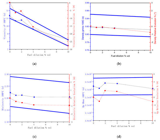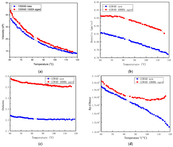 New and aged engine oil (15W40): (a) viscosity; (b) density; (c) dielectric; and (d) Rp.