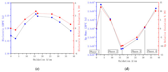 During Phase 2, the tested oil resistivity is decreased up to −10% at 120 °C, relative to the initial value, and the dielectric showed a significant increase. Phase 2 corresponds to a predominance of a slow chemical process that releases charge carriers and polar compounds.