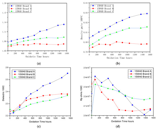 Engine oil (15W40 brands A, B and C) oxidation at 100 °C: (a) viscosity; (b) density; (c) dielectric; and (d) Rp.