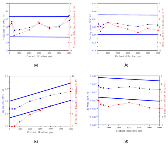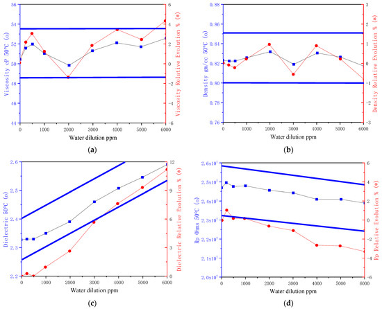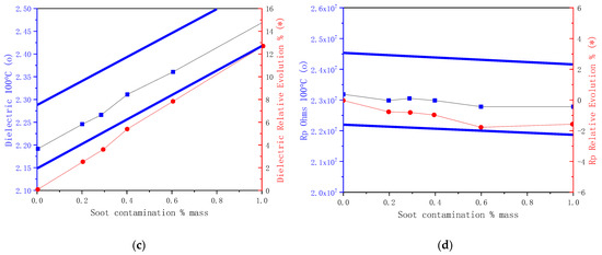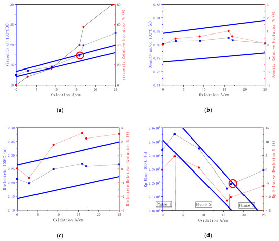Viscosity, density, and dielectric constants are increased during aging. Without any contamination, increases in the three parameter can be considered normal, even if we also observe viscosity decreases due to oil shear. The increase in resistivity at high temperatures is due to depletion of free charge carrier additives [35]. The gradients of variations will depend on oil type and application characteristics, such as temperature or contamination.