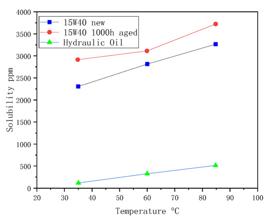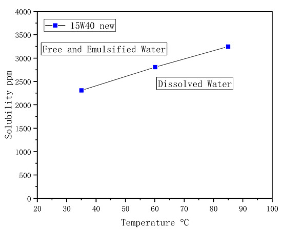 Water has three different states in oil: dissolved water, emulsified water, and free water. Dissolved water is characterized by dispersed individual water molecules chemically linked to the oil. Above this level, called solubility, the excess water is saturated and will not be chemically linked to the oil; free water is formed, leading to a two-phase system. Because the density of water is higher than that of oil, free water typically accumulates at the bottom of the oil pan. When the mixing ratio is sufficiently high, or in the presence of surfactant additives, an emulsion can be formed. Emulsified water is homogeneously dispersed into the oil [40].