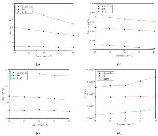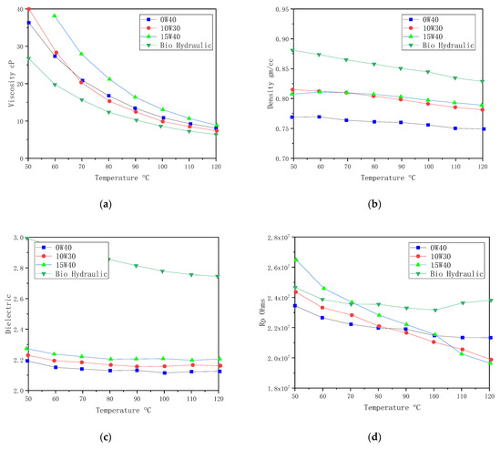 Measurements of 0W40, 10W30, 15W40 oils and biohydraulic oil: (a) viscosity; (b) density; (c) dielectric; and (d) Rp.