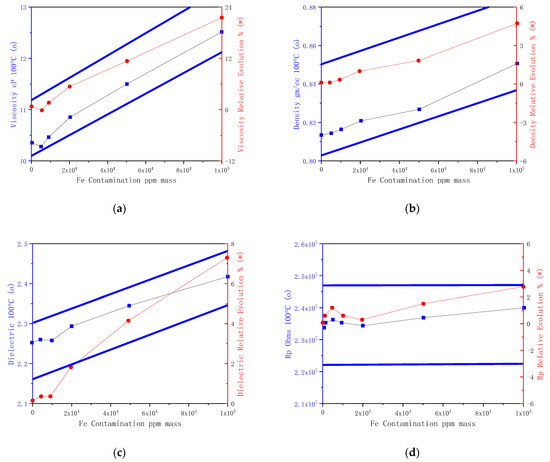 Fe contamination in engine oil (15W40) at 100 °C: (a) viscosity; (b) density; (c) dielectric; and (d) Rp.
