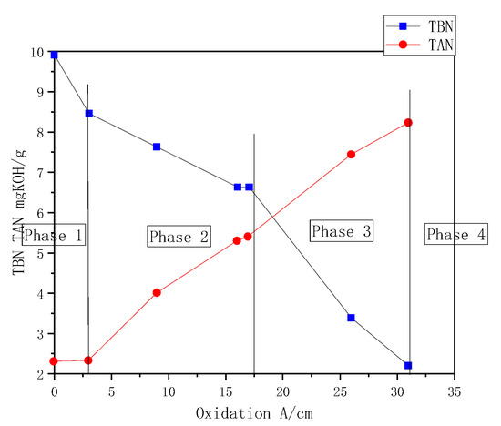 The results show a continuous decrease in TBN and a continuous increase in TAN as oxidation increases. The four different phases of oil degradation described in Figure 18 can also be considered. During Phase 1 and Phase 2, the TBN value was higher than the TAN value. At the end of Phase 2, the TAN value reached the TBN value and surpassed the TBN value. TBN and TAN measurements corresponding to the 38 A/cm sample from Figure 18 were not performed because of the excessive degree of oil degradation, from which the oil was indeed completely jelled.