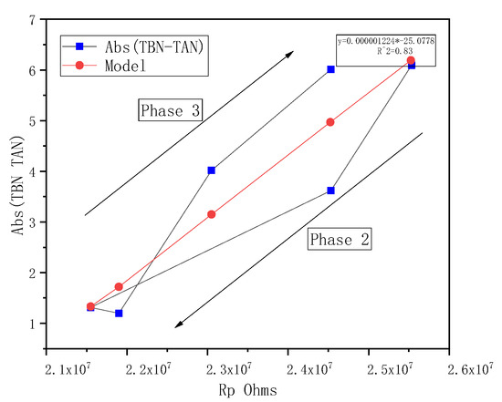 As described in Figure 19, resistivity increased during Phase 1. Phase 1 is relatively short-lived, and the level of resistivity increase depends on the oil chemical composition and application characteristics. Then, the resistivity decreases during Phase 2 until it reaches a minimum and increases again during Phase 3. |TBN-TAN| has similar behavior, starting from a high value (because fresh oil has alkaline reserve and low acid concentration) and decreasing during Phase 2 until a minimum is reached, and then increasing during Phase 3 due to creation of acidic compounds and neutralization of alkaline species. A clear correlation (R2 = 0.83) is demonstrated between resistivity and |TBN-TAN|. A similar correlation has been described in the literature. |TBN-TAN| can be modeled using Equation (44) at a constant temperature: