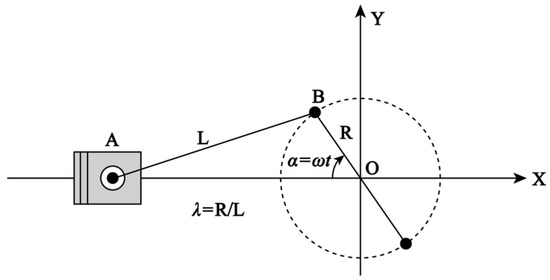 A schematic of a single-cylinder piston engine crankshaft-connecting rod mechanism is shown in Figure 1. Herein, is the reciprocating mass of the piston crankshaft-connecting rod mechanism, is the crankshaft radius, is the length of the connecting rod, and is the ratio of crankshaft radius to connecting rod length (i.e., , generally taking the value of 1/3). Further, is the crank angle and is the angular velocity of crankshaft rotation.