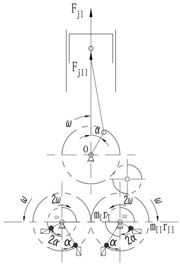 In Equation (2), the inertial force can be divided into first-order inertial force, second-order inertial force, fourth-order inertial force, etc., by multiples of the angular velocity of the engine rotation; that is, For commercial piston single-cylinder engines, its balance mechanism generally only balances the first-order inertia force. In multi-cylinder engines, the first-order inertia force can be self-balanced by designing the spatial configuration of the crankshaft, and the second-order inertia force needs to be balanced by setting a second-order balance mechanism.