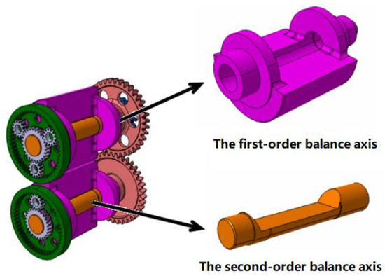 Based on the above mechanical design principles and the idea of a compact unit body, a novel coaxial second-order balance mechanism was designed in this study, as shown in Figure 3. The novel coaxial balance mechanism is a unit-body module, including shell, first-order balance shafts, second-order balance shafts, and planetary gear transmission mechanisms. The second-order balance shafts are installed in the shaft hole of the first-order balance shafts; their rotational axes coincide. The external gear with internal teeth (i.e., the internal gear in the planetary gear mechanism) is fixed at one end of the first-order balance shaft. The internal gear with the external teeth (the sun gear in the planetary gear mechanism) is fixed at one end of the second-order balance shafts, and the middle gear (the planetary gear in the planetary gear mechanism) meshes with the internal gear and the external gear, respectively, thereby transmitting the rotation of the first-order balance shaft to the second-order balance shaft through the planetary gear mechanism.