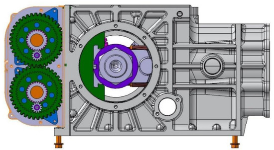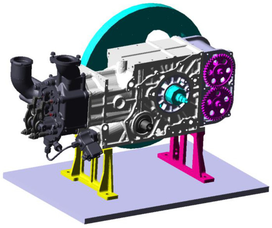 In the proposed balance mechanism, both first- and second-order balance shafts were installed in the shell, and only a rotating input gear was needed to connect to the crankshaft. The unit-body design could be used to arrange the parts and components of the engine more flexibly without increasing the size of the engine. In addition, the structure improved the assembly form of a conventional engine and adopted an integral installation mode, which is quick and straightforward to install and disassemble. This structure could be widely used in various types of piston engines to reduce the vibration and noise of the engine and improve its service life. The layout of the compact coaxial balance mechanism installed on the single-cylinder engine is shown in Figure 5.