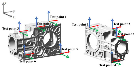 To verify the vibration reduction effect, we select six test points on the engine body, the location of which are shown in Figure 7. Using dynamic simulation, we compared the first-order balance mechanism with the novel coaxial balance mechanism based on the closed-form method under four different crankshaft speeds (800, 1500, 1800, and 2350 r/min) and one based on the novel closed-form method. Additionally, the average root mean square velocity (denoted as the velocity (RMS)) of the six test points in the direction of piston motion (Y direction) was compared under two cases in which the coaxial balance mechanism based on the novel closed-form method was installed or the coaxial balance mechanism using the second-order balance mass of the conventional design was installed. When the velocity (RMS) was smaller in this direction, the vibration reduction effect was improved.