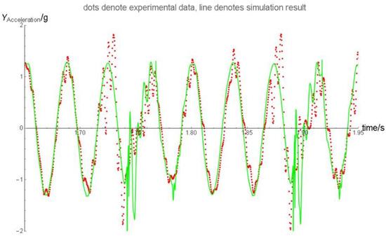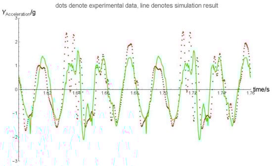 To validate the simulation model, we carried out a vibration experiment of the DK32 single-cylinder engine, as shown in Figure 8. The acceleration time-domain curves in the direction of piston motion (Y direction) of test point 6 at speeds 800 and 1500 r/min are shown in Figure 9 and Figure 10, respectively. These figures show that the simulation results were highly consistent with the experimental results. At the speed of 800 r/min, the average root mean square acceleration of experiment and simulation at test point 6 were 0.84 and 0.88 g, respectively. At the speed of 1500 r/min, the average root mean square acceleration of the experiment and simulation at test point 6 were 1.1 and 0.97 g, respectively. The computation model and method proposed in this article were thus verified.