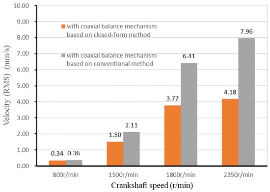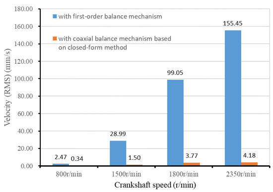 The average velocity (RMS) in the direction of piston motion of the six test points from the installations of a first-order balance mechanism and a novel coaxial balance mechanism based on the closed-form method.