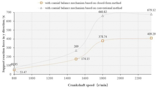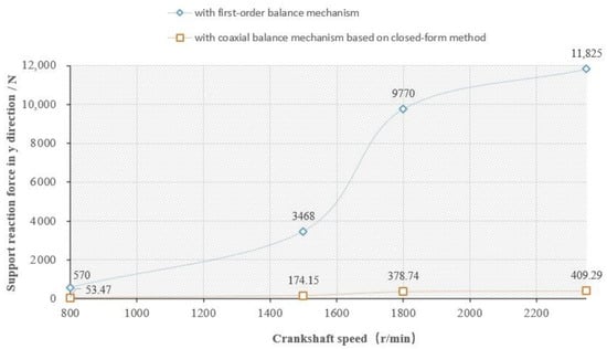 The support reaction force between the plate and the ground, which is another important indicator of the vibration reduction effect, was also calculated when the single-cylinder engine was operating. The results show that, when the support reaction force was smaller, the vibration reduction effect was better. Figure 12 indicates the support reaction force from the installations of a conventional first-order balance mechanism and a novel coaxial balance mechanism under different crankshaft speeds. At 800, 1500, 1800, and 2350 r/min, compared with the first-order balance mechanism, the support reaction force of the novel coaxial balance mechanism was reduced by 90.62%, 94.98%, 96.12%, and 96.54%, respectively.