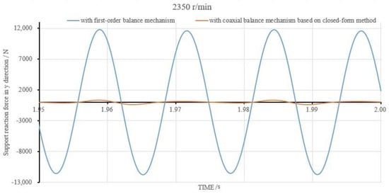 Support reaction force in the direction of piston motion from the installations of a first-order balance mechanism and a novel coaxial balance mechanism based on the closed-form method.