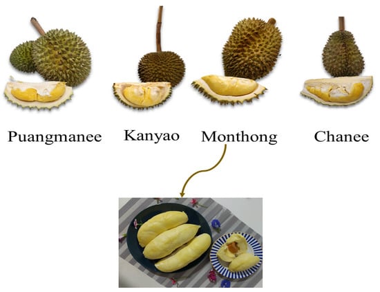Four local Thai durian cultivars were investigated in the present study. Durian fruits (Durio zibethinus Murr.) of three cultivars Monthong, Chanee, and Puangmanee (Figure 1) were obtained in the ripe stage, according to the definition of ripe durian flesh (DR): harvested and left to soften for several days (Table 1). In these fruits, which were accepted as ripe ones, the amount of total soluble solids (TSS, %) showed the following values: 25.21 ± 0.43; 25.17 ± 0.41; 25.48 ± 0.39; pH was in the order of 6.81 ± 0.01, 6.68 ± 0.04, 6.79 ± 0.02; acidity (% of malic acid): 0.17 ± 0.01, 0.17 ± 0.01 and 0.15 ± 0.01.