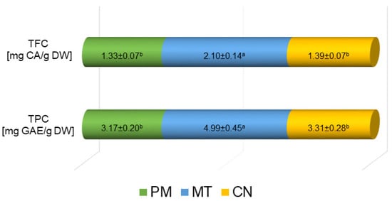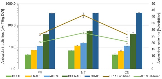 The values of five different antioxidant assays are presented in Figure 3. The results of the DPPH assay were the lowest and of ORAC are the highest. The results of antioxidant activities were expressed in µM TE/g DW and showed the following numbers: DPPH—from 4.58 ± 0.43 to 7.05 ± 0.22; FRAP—from 6.82 ± 0.29 to 11.69 ± 0.31; ABTS—from 11.37 ± 0.15 to 15.88 ± 0.37; CUPRAC—from 39.76 ± 7.21 to 56.18 ± 5.89 and ORAC—from 360.87 ± 14.38 to 377.64 ± 18.11.