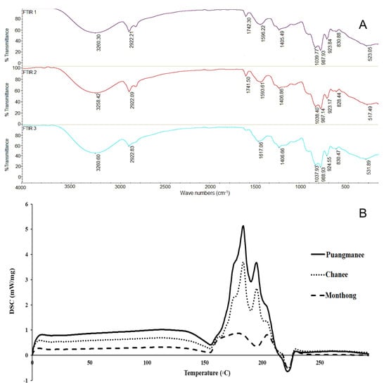 (A), Fourier transform infrared (FTIR) spectra of polyphenols of durian extracts from the top: Monthong, Chanee and Puangmanee. (B), Differential scanning calorimetry (DSC) measurements of Puangmanee, Chanee and Monthong.