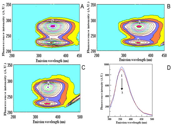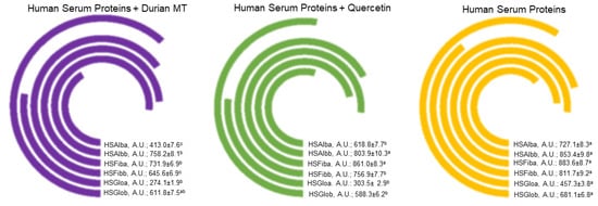 Lower changes in comparison with the fluorescence intensities of peak a appeared in the position of peak b: the highest peak for durian extract (611.8 A.U.) and the lowest was measured for tannic acid (229.1 A.U.). The images of the interaction of HSGlob with standards and durian showed the maximum peaks a and b and their locations (Figure 6Aa,Ba). The comparison of the values of fluorescence intensity of the native HSGlo (Figure 6C, line 1 from the top) showed that the lowest value was obtained by its interaction with tannic acid (Figure 6C, line 4). Quercetin showed lower bioactivity than tannic acid.