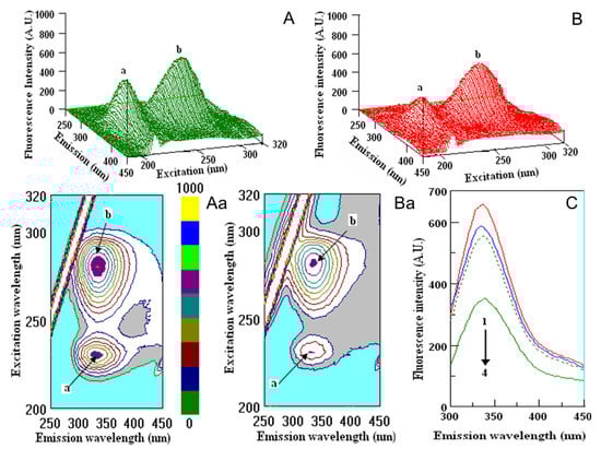 Fluorometric measurements in three-dimensional fluorescence analysis (3D-FL) of durian extracts after interaction with globulin (A,B), globulin (HSGlo) in buffer, Glo + Monthong; (Aa) and (Ba), their cross images. (C), Spectral data of two-dimensional fluorescence measurements (2D-FL) of durian extract, standards and Glo from the top: 1, 2, 3, 4, Glo (FI = 658.57 A.U.), Glo + durian (FI = 587.25 A.U.); Glo + quercetin (FI = 554.04 A.U.); Glo + tannic acid (FI = 353.19 A.U.); Abbreviations: Glo, globulin; FI, fluorescence intensity, A.U., arbitral units; The location of peaks a and b are shown in Figure 5, Figure 6 and Figure 7 (for interpretation of the references to color in this figure legend, the reader is referred to the web version of this article).