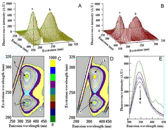 Fluorometric measurements in three-dimensional fluorescence analysis (3D-FL) of durian extracts after interaction with fibrinogen. (A,B), 3D-FL of Fib in buffer, Fib+ durian Monthong; (C,D), their cross images. (E), Spectral data of two dimensional fluorescence measurements (2D-FL) of durian extracts and Fib from the top: 1, 2, 3, 4, 5, 6, Fib (FI = 834.71 A.U.), Fib + quercetin (FI = 680.42 A.U.); Fib + caffeic acid (FI = 671.79 A.U.); Fib + catechin (FI = 606.17 A.U.); Fib + MT (FI = 584.43 A.U.); Fib + tannic acid (FI = 538.23 A.U.) Abbreviations: Fib, fibrinogen, FI, fluorescence intensity, A.U, arbitral units; The location of peaks a and b are shown in Figure 5, Figure 6 and Figure 7 (for interpretation of the references to color in this figure legend, the reader is referred to the web version of this article).