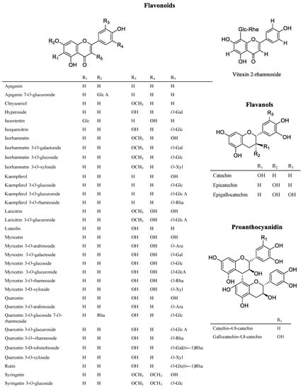 Several glycosides of myricetin and quercetin were identified in V. myrtillus. Different studies reported the presence of myricetin 3-glucoside, myricetin 3-arabinoside, myricetin 3-O-rhamnoside, quercetin 3-O-arabinoside, quercetin 3-O-rhamnoside, quercetin 3-O-galactoside, quercetin 3-O-glucoside, and quercetin 3-O-rutinoside [,,,]. Apigenin, chrysoeriol, myricetin, myricetin-3-xyloside, quercetin 3-O-glucuronide, quercetin 3-O-xyloside, isorhamnetin 3-O-glucoside [], luteolin are other flavonoids described in V. myrtillus []. Kaempferol, isorhamnetin, laricitrin, syringetin, isorhamnetin 3-O-galactoside, myricetin 3-O-glucuronide, laricitrin 3-O-glucoside, syringetin 3-O-glucoside [,,], kaempferol 3-O-glucoside, myricetin 3-O-galactoside, and isorhamnetin 3-O-xyloside are also described [].