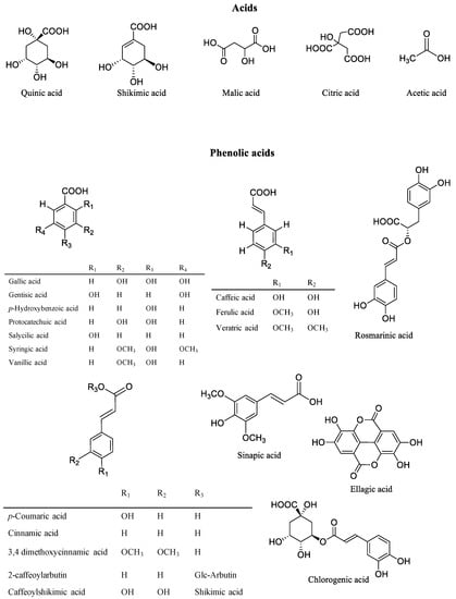 Main acids and phenolic acids in the Vaccinium genus [,,,,].