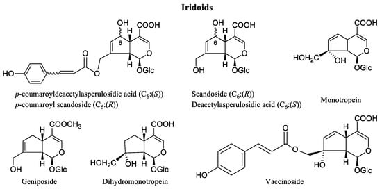The Figure 4 shows the main iridoids identified in Vaccinium species. These compounds have often been identified in mixtures and have not always been isolated. The stereochemistry of the asymmetric carbons of some of them has not been elucidated. Asperuloside, scandoside, and monotropein, and their derivatives, seem to be representative of the genus [,].