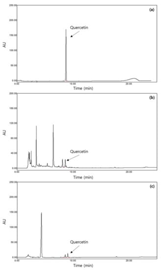 Comparison of HPLC chromatogram of quercetin and two samples: (a) quercetin standard; (b) AW, hot water extraction of outer layers of leaf skin of Aloe vera at 100 °C for 24 h; (c) AF, L. plantarum fermentation of outer layers of leaf skin of Aloe vera at 37 °C for 3 days and further extracted by an ultrasonicator at 40 kHz for 1 h at room temperature.