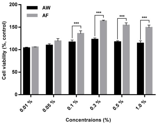The cytotoxicity of the samples was determined by using the 3-(4,5-dimethythiazo-2-yl)-2,5-diphenyltetrazolium bromide (MTT) assay []. For this experiment, 1.0 × 104 human fibroblast cells/well (CCD-986sk, ATCC, Manassas, VA, USA) were inoculated into a 96-well plate and subsequently incubated with DMEM supplemented with 10% (v/v) fetal bovine serum (FBS) (GIBCO, Bend, OR, USA), 1% gentamycin sulfate (Sigma, St. Louis, MO, USA), and HEPES buffer (Sigma, St. Louis, MO, USA) in a 5% CO2 incubator at 37 °C for 24 h. Then, 200 μL of various concentrations of AW and AF were added into the cells and cultured for 24 h. Then, a 5 μg/mL of MTT solution was added to each well, and the supernatant was removed 4 h later. Thereafter, 10 µL of acid-isopropanol (0.04 N HCl in isopropanol) were added to the wells, and the absorbance of the solution was measured using a microplate reader (Thermo Fisher Scientific, Waltham, MA, USA) at a wavelength of 565 nm. Cytotoxicity was estimated as the percentage of the ratio of cell growth of the treated samples to that of untreated cells as a control using the following Equation (1):