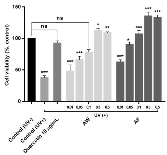 Comparison of mitochondrial reductase activities in UVb-irradiated human skin fibroblasts treated with 10 µg/mL quercetin and various concentrations of the two aloe extract samples. AW: Hot water extraction of Aloe vera leaf skin at 100 °C for 24 h. AF: L. plantarum fermentation of Aloe vera leaf skin at 37 °C for 3 days and extraction with an ultrasonicator at 40 kHz for 1 h at room temperature. The mean values ± SD for separate triplicate experiments are shown, and the error bars represent the SD. The significance of the difference was set to * p < 0.05, ** p < 0.01 and *** p < 0.001 compared with the control (UV−) group.